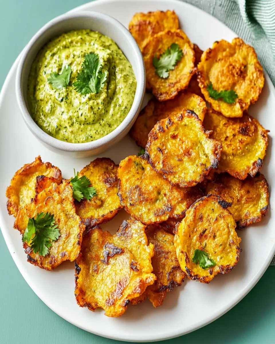 Delicious crispy tostones served with a zesty cilantro dip, perfect as an appetizer or snack.