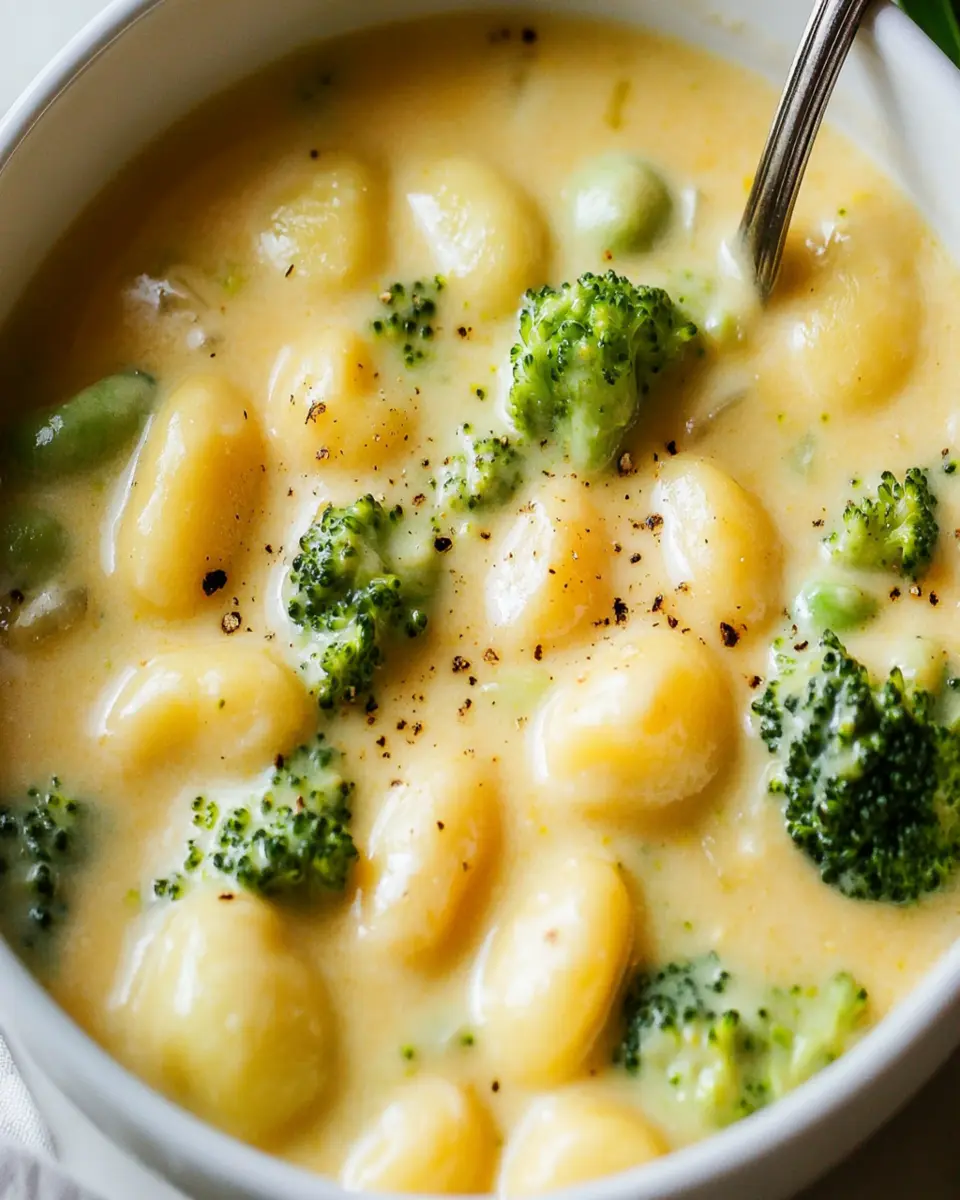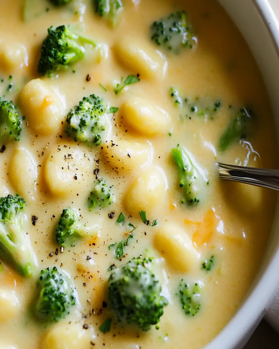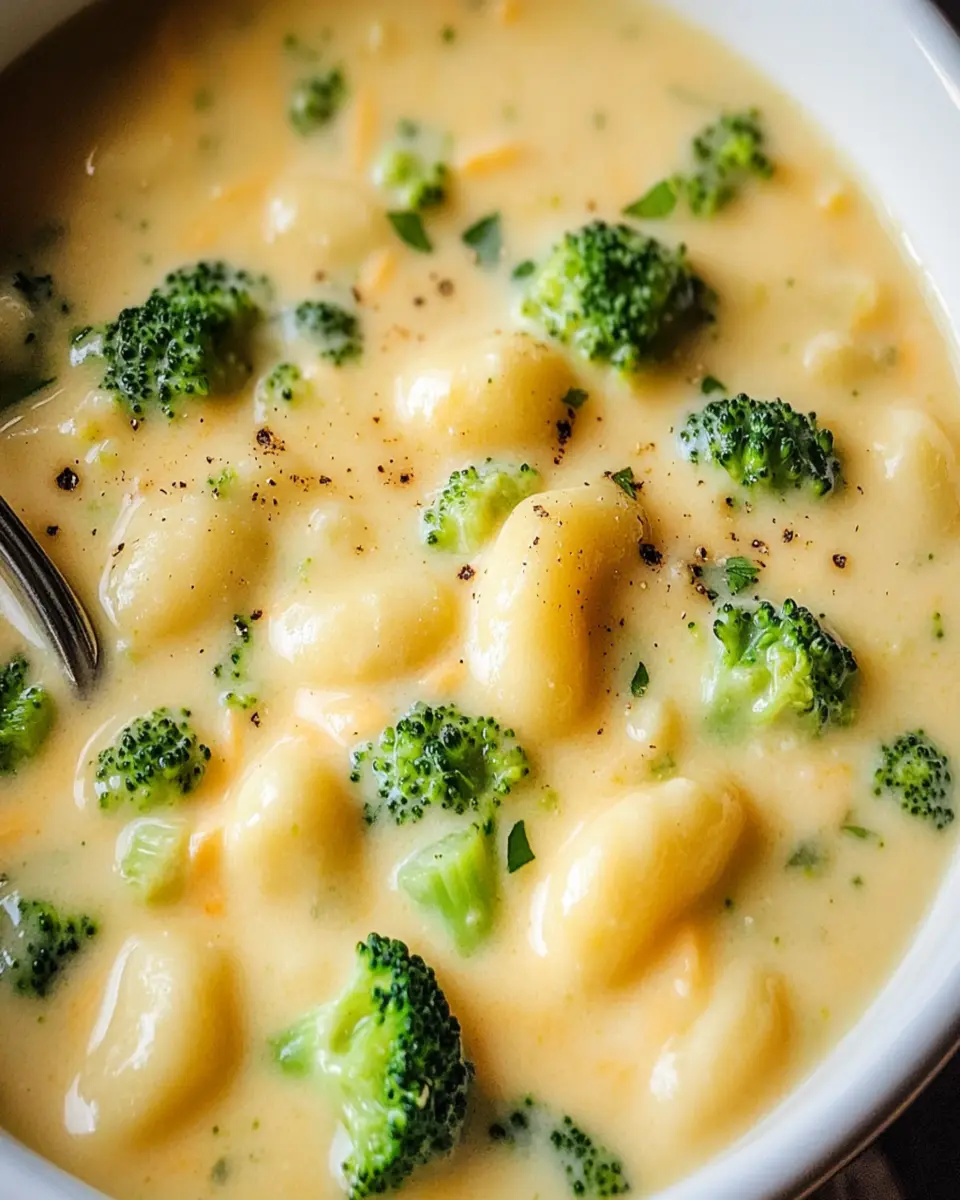 A creamy and comforting soup made with tender gnocchi, fresh broccoli, and rich cheddar cheese.