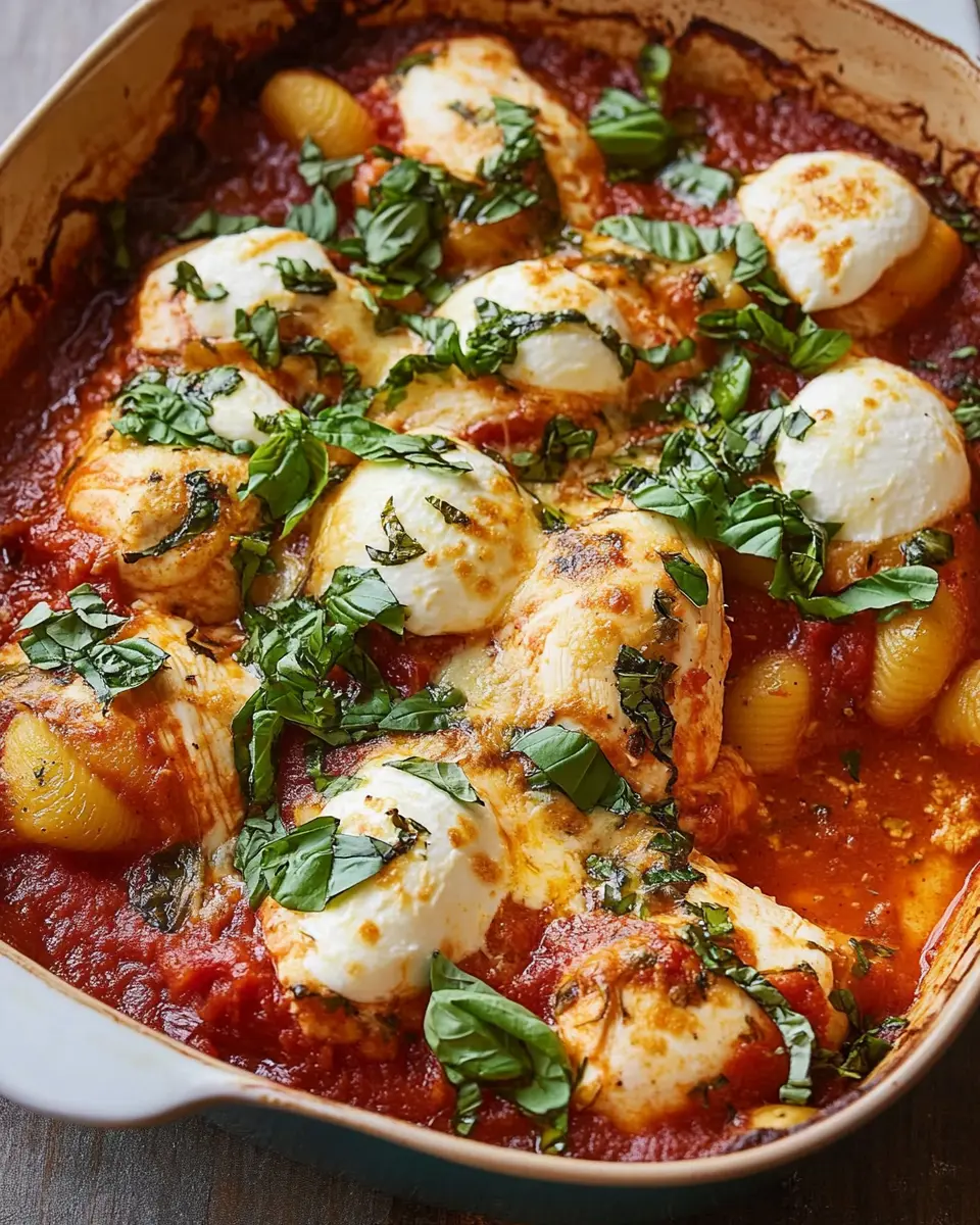 Caprese Chicken & Polenta Bake is a delicious dish that combines juicy chicken breasts with creamy polenta, topped with mozzarella cheese, cherry tomatoes, and fresh basil. It’s a comforting and hearty meal that embodies Italian flavors, making it perfect for any occasion.
