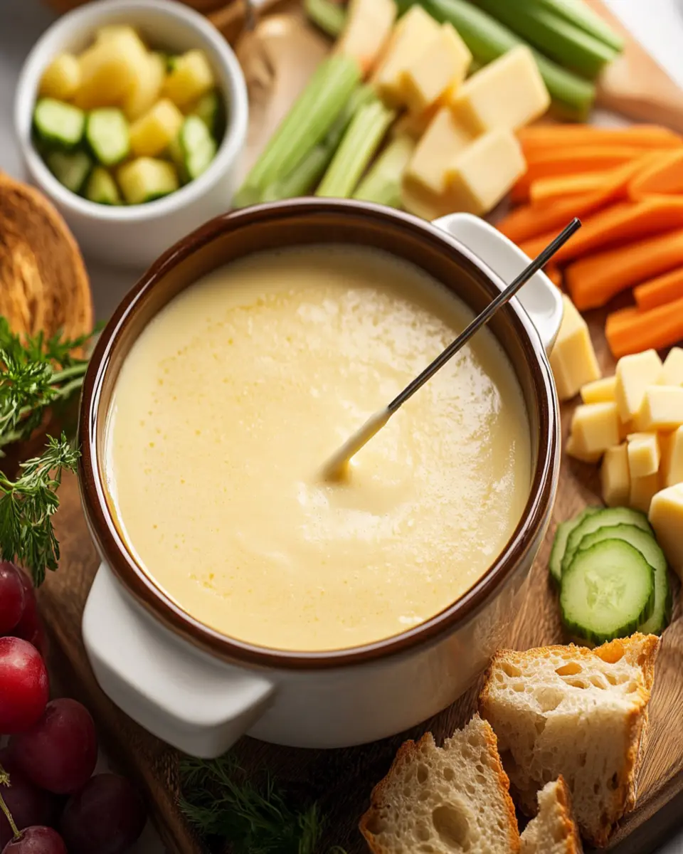 A deliciously creamy and melty cheese fondue that is perfect for dipping bread, vegetables, or fruit.