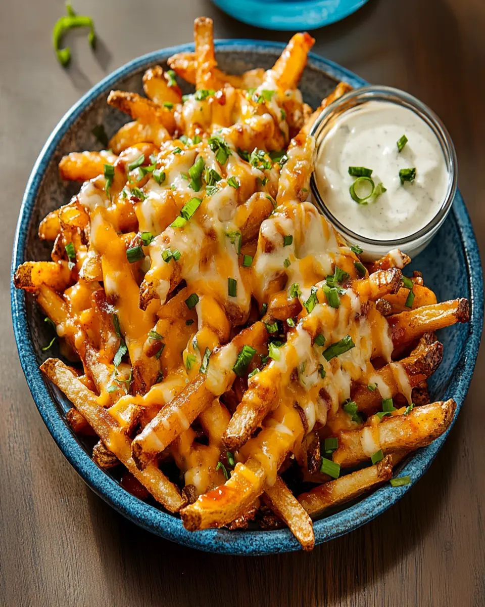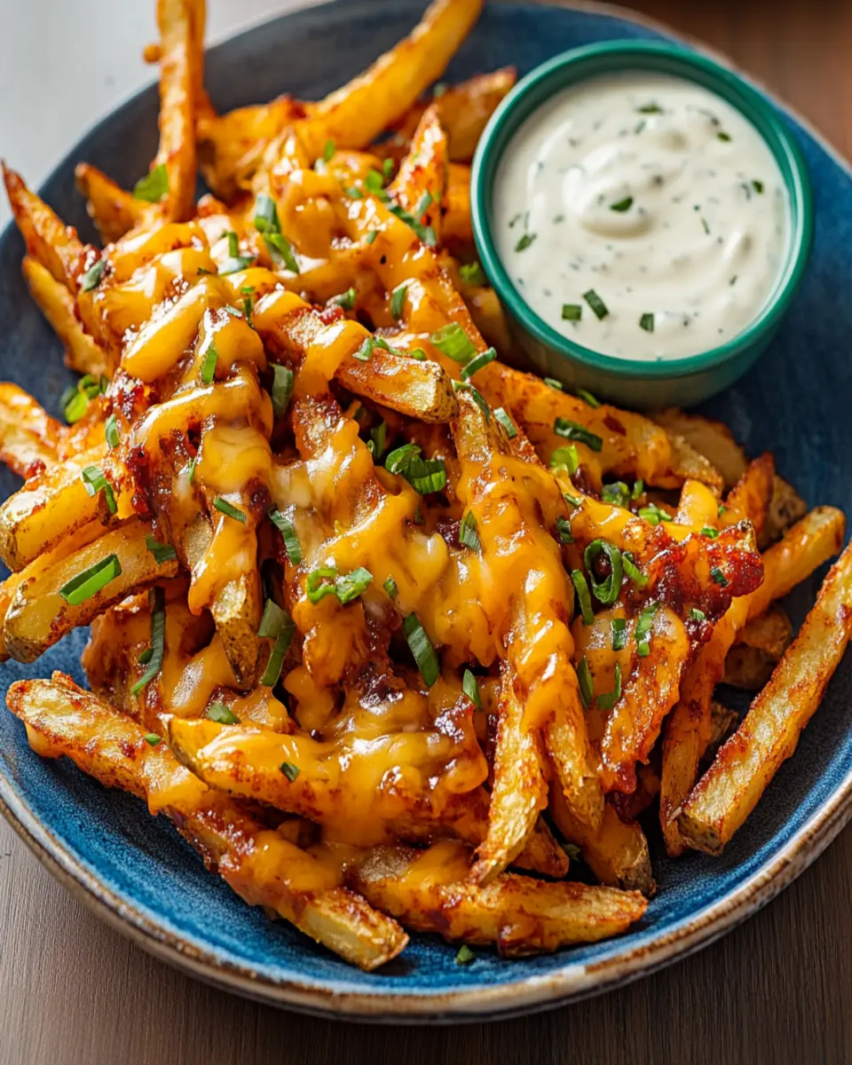 Deliciously cheesy BBQ fries served with a creamy ranch dip, perfect for a snack or appetizer!