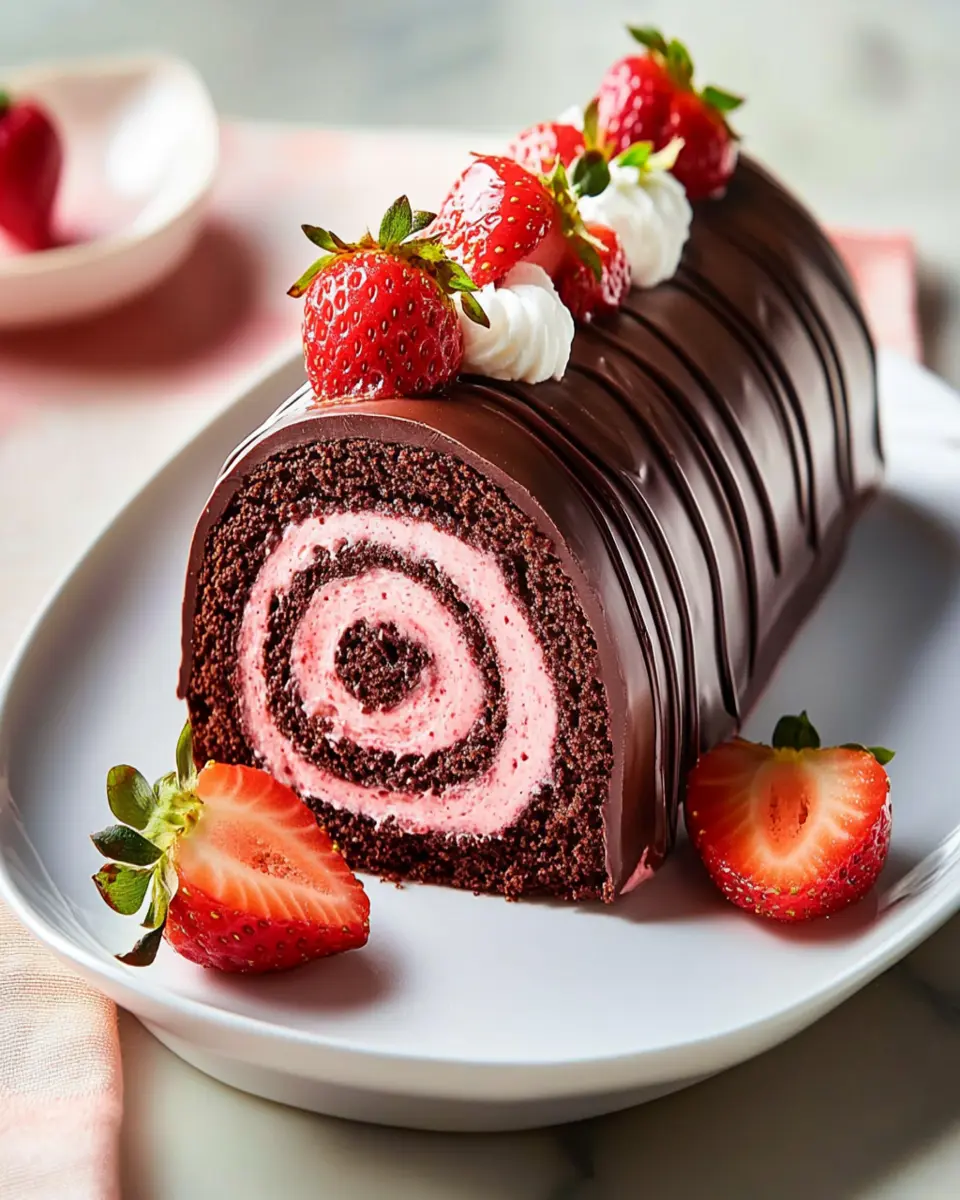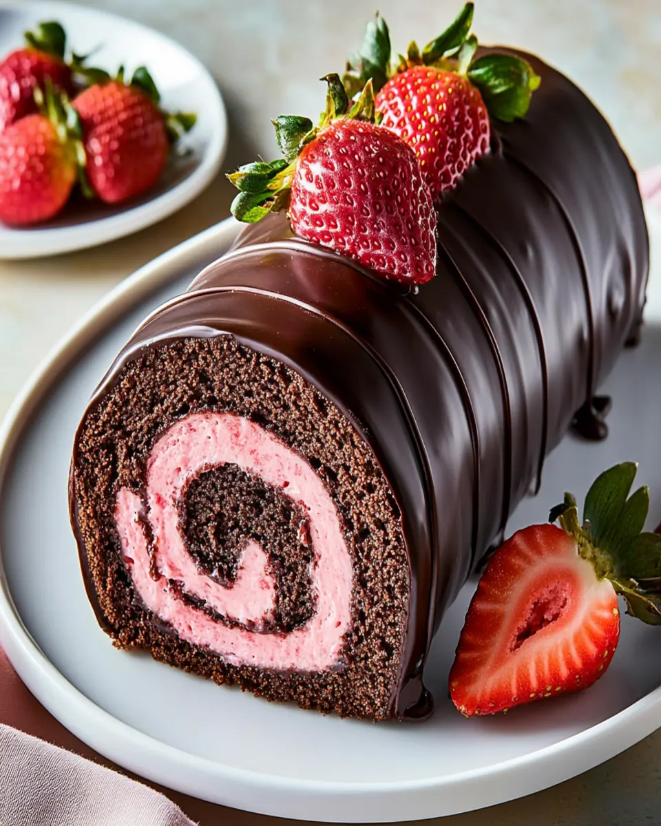 A decadent chocolate-covered strawberry swiss roll cake that brings together rich chocolate cake and sweet strawberries.