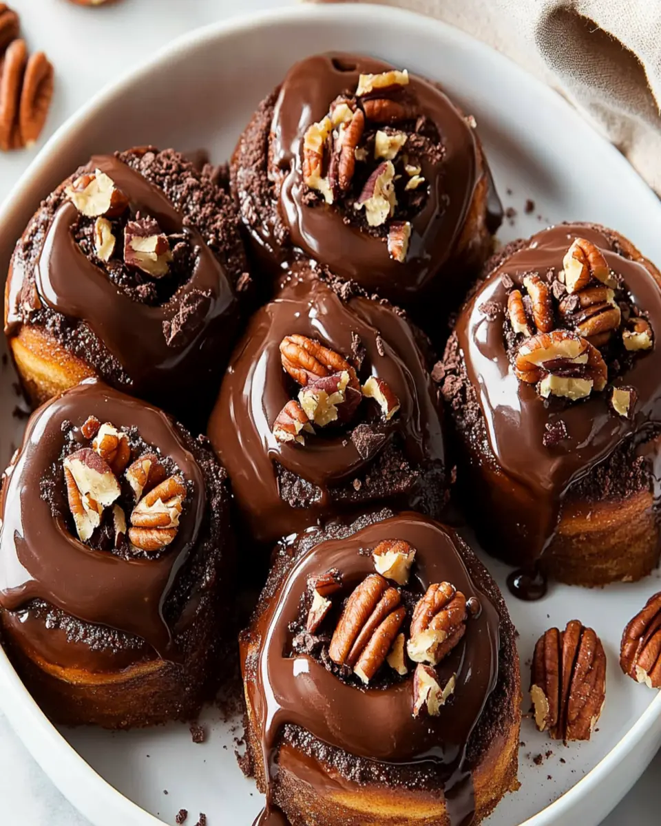 Chocolate Pecan Cinnamon Rolls are deliciously soft, sweet rolls filled with a mix of rich chocolate and crunchy pecans, all topped with a creamy glaze. They are a delightful treat perfect for breakfast or dessert, combining the classic flavors of cinnamon rolls with the added richness of chocolate and nuts.