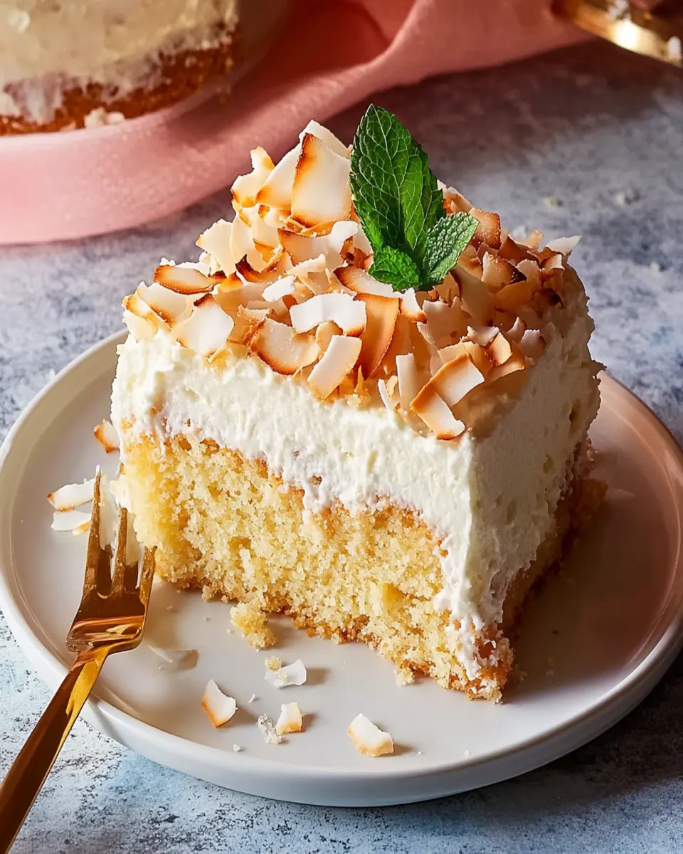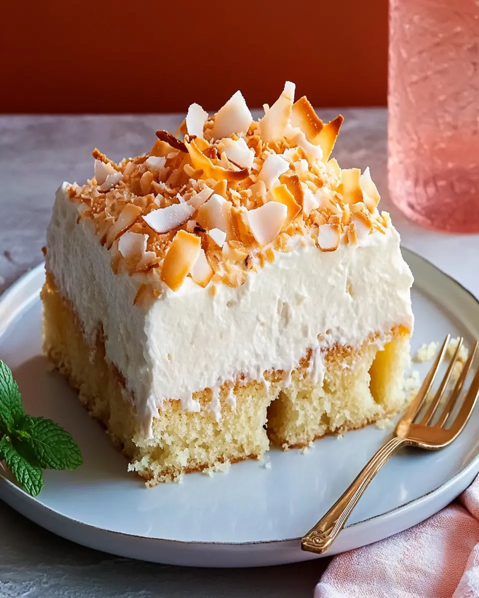 One of the best things about Coconut Poke Cake is its ability to please a crowd. The combination of fluffy cake soaked in creamy coconut milk and topped with a light, airy frosting is irresistible. Whether you’re hosting a summer barbecue or a cozy family dinner, this cake is guaranteed to be a hit. Plus, it’s a dessert that looks impressive but is incredibly simple to make, allowing you to enjoy the accolades without the stress.