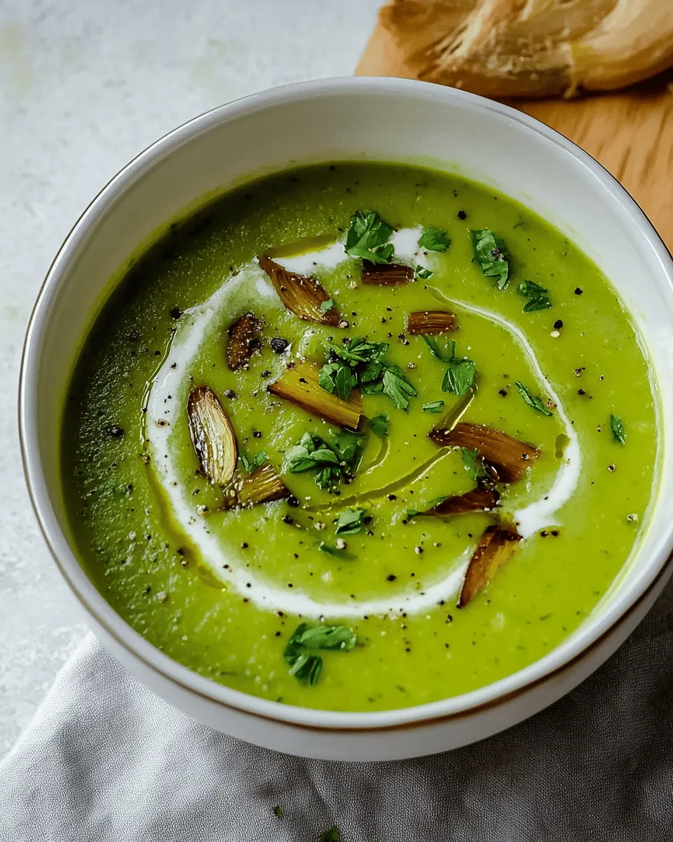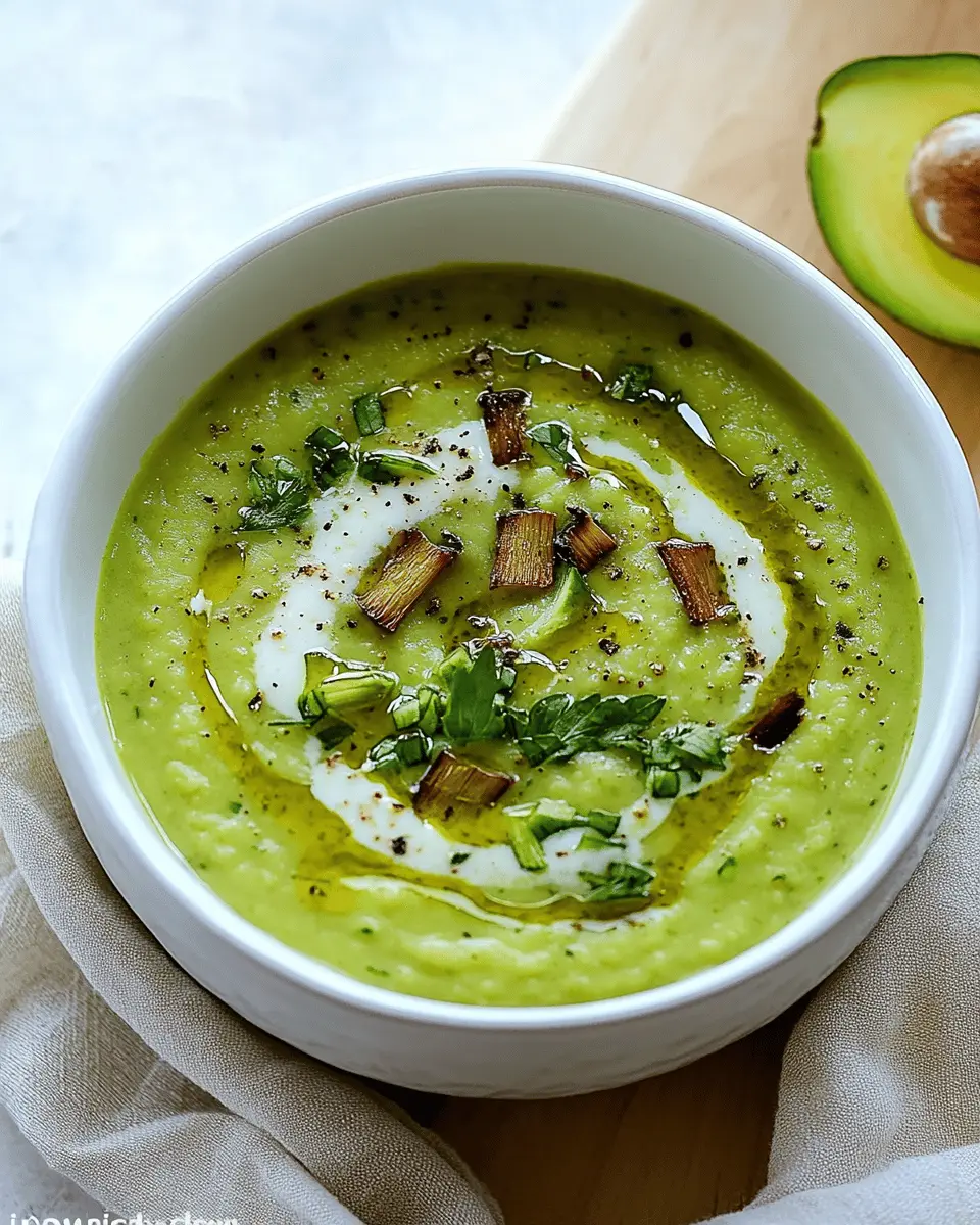 A smooth and creamy soup featuring leeks and avocados, perfect for a light meal.