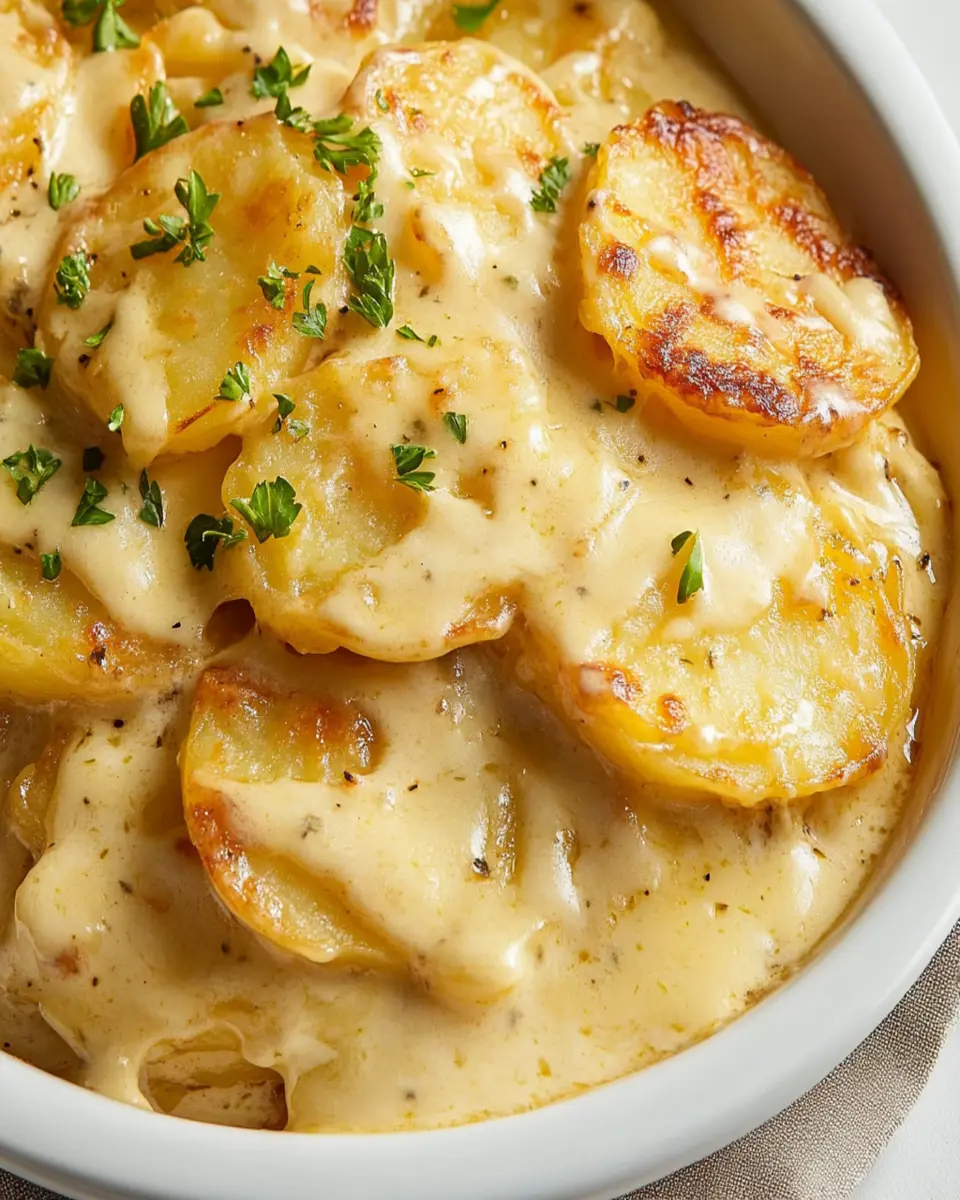 A creamy and comforting side dish made with layers of thinly sliced potatoes and a rich sauce, all cooked to perfection in a crockpot.