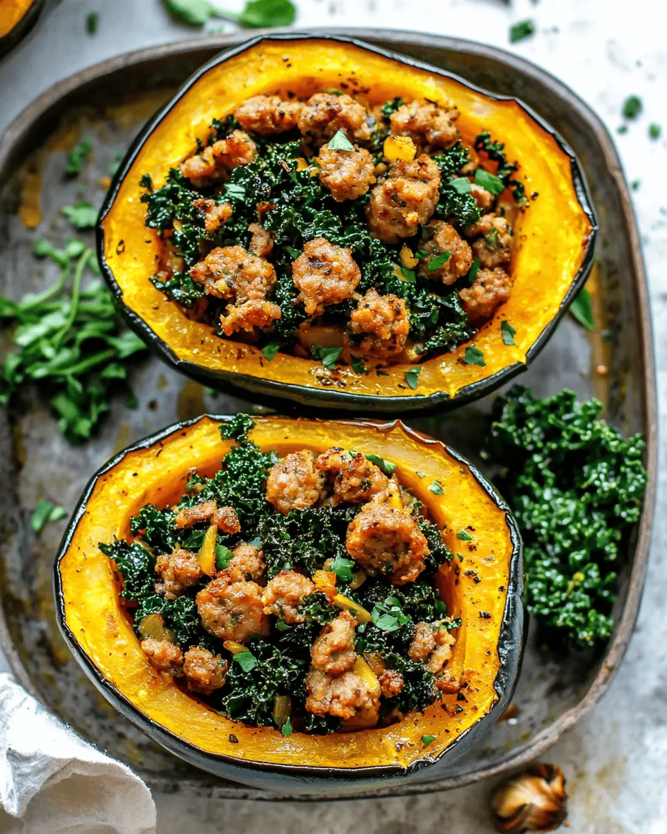 This Easy Stuffed Acorn Squash recipe features savory sausage and healthy kale, making for a delicious and nutritious dinner option.