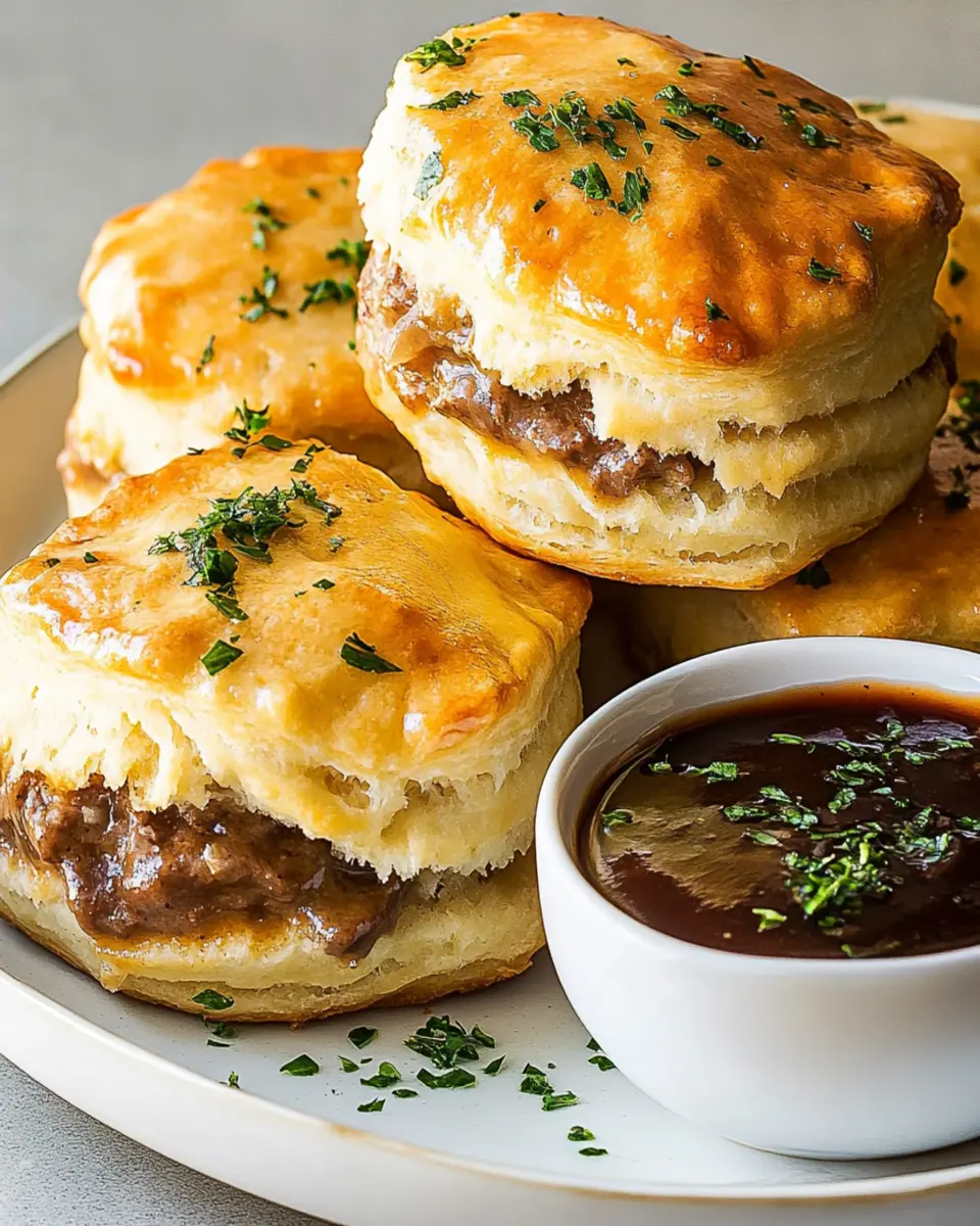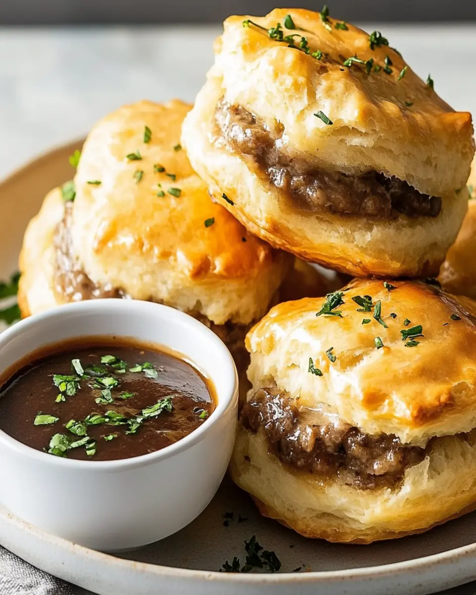 Delicious biscuits stuffed with savory beef and served with a rich au jus for dipping.