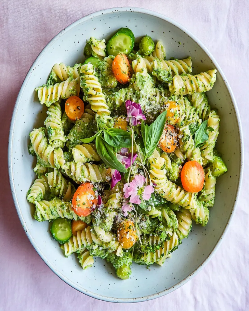 A refreshing and vibrant pasta salad featuring a creamy green goddess dressing, fresh vegetables, and herbs.
