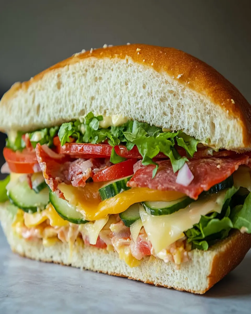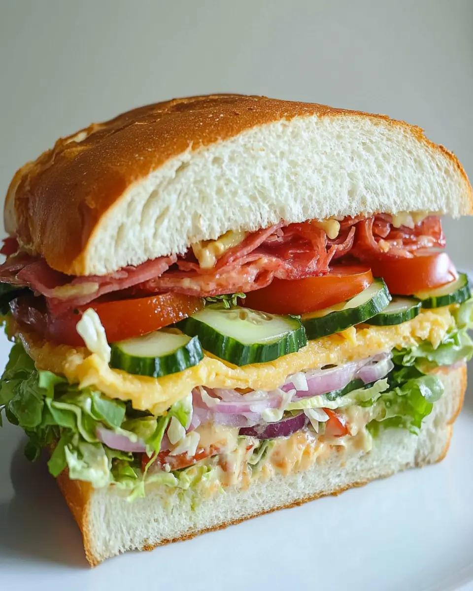 Layer your meats and veggies thoughtfully. Begin with the meats at the bottom to help anchor the sandwich, followed by the crunchy vegetables. This prevents the toppings from sliding out and keeps every bite balanced.