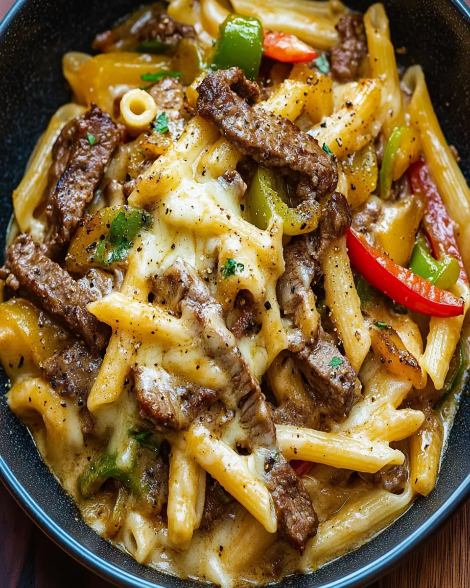 This Philly Cheesesteak Pasta is a delicious twist on the classic sandwich, combining tender pasta with flavorful steak and peppers.