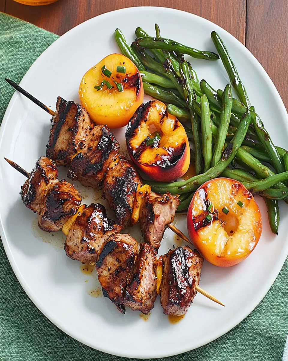 Delicious pork and peach kebabs paired with grilled green beans for a perfect summer meal.