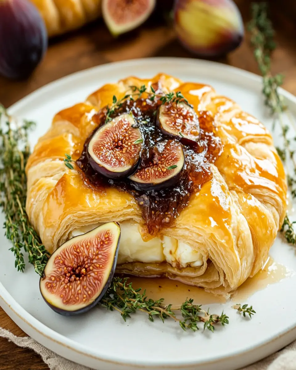 A delicious and elegant appetizer featuring warm, gooey brie cheese baked in flaky puff pastry and topped with sweet fig jam.
