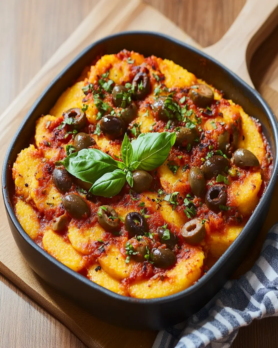 A delicious and hearty Puttanesca Polenta Bake combining the flavors of Italy, featuring a rich tomato sauce, olives, and creamy polenta.