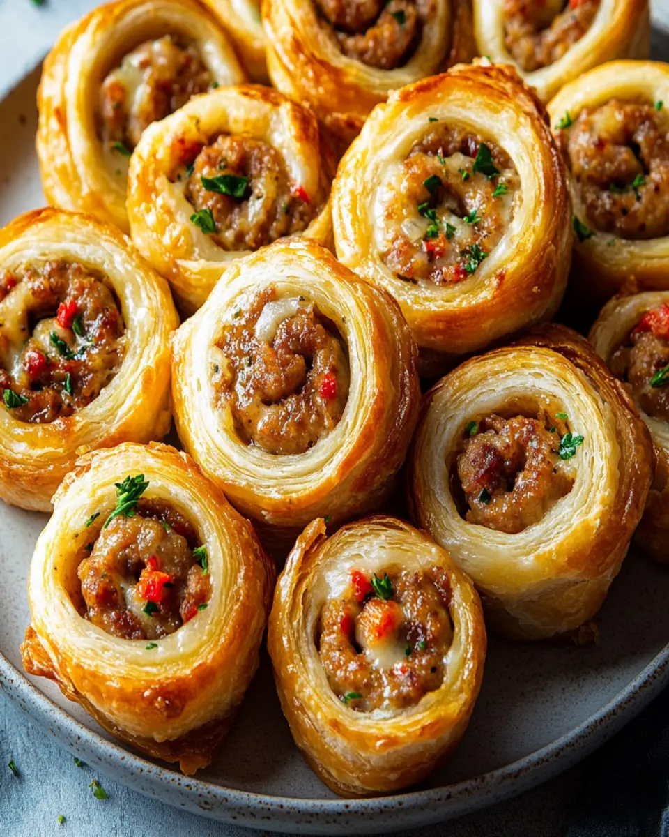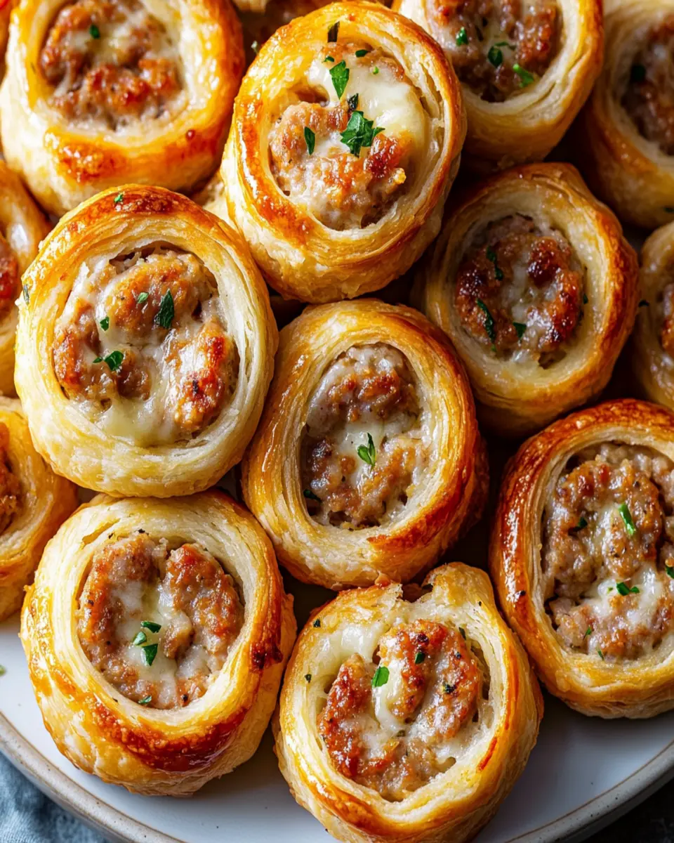 Delicious sausage pinwheels made with flaky pastry and seasoned sausage, perfect for appetizers or party snacks.