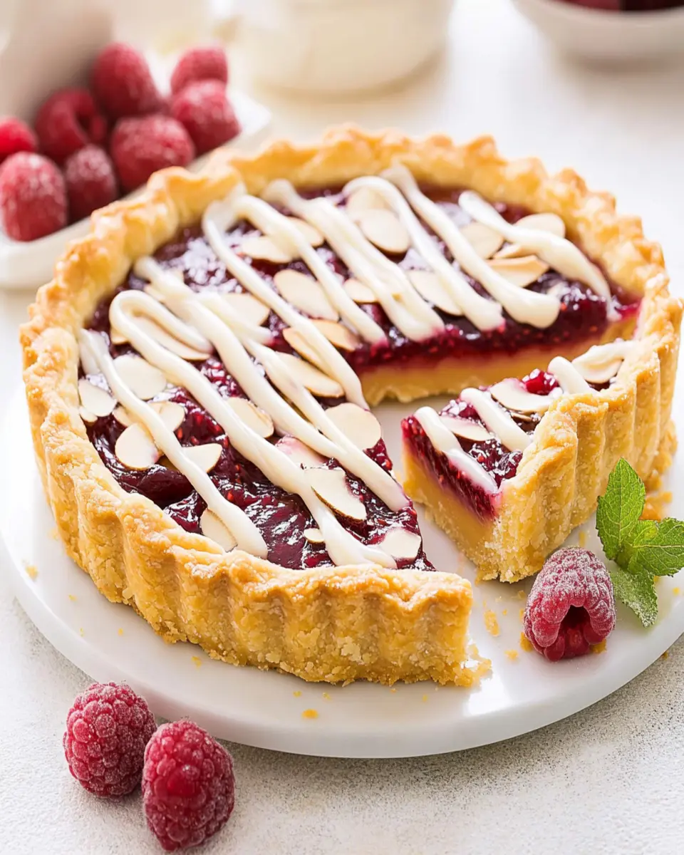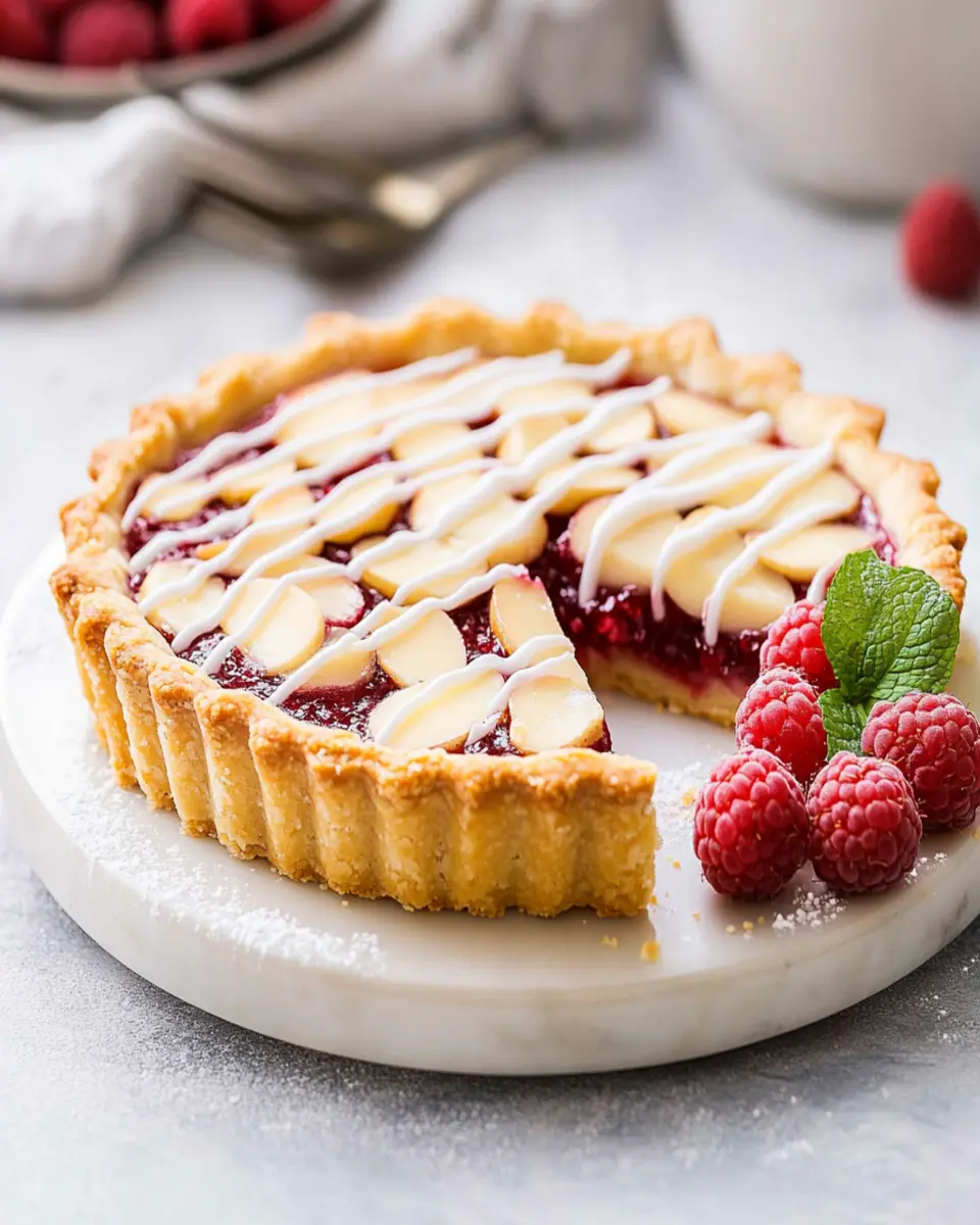 A classic English tart with a sweet almond filling, raspberry jam, and a flaky pastry crust.