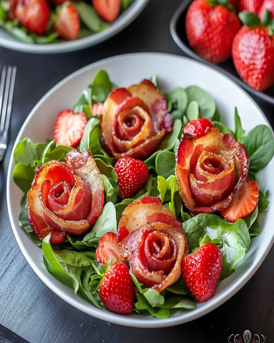 Preparing this salad is more than just cooking; it’s about creating an experience. As you wrap the bacon into roses, you might find yourself reminiscing about past Valentine’s celebrations or dreaming of future ones. The vibrant colors of the strawberries and greens complement the crispy bacon, making this dish not just a feast for the palate, but also for the eyes.
