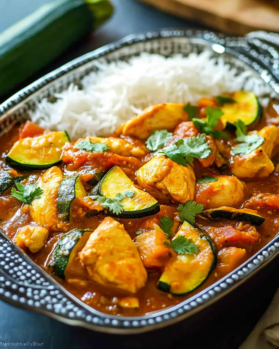 Serving this hearty stew over steamed basmati rice is a timeless tradition that allows you to soak up every drop of the delicious broth. The fluffy rice complements the tender chicken and zucchini, creating a satisfying combination that is sure to please.